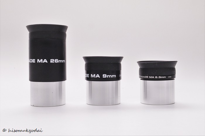 付属のアイピースはMA26mm、9mm、6.3mm の3本。